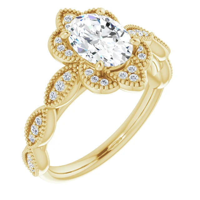 This piece exudes timeless elegance with its floral-inspired halo, showcasing a brilliant oval center stone...