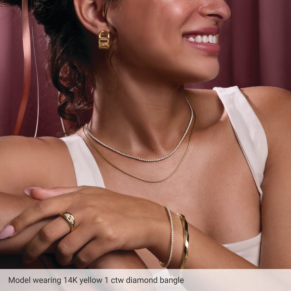A timeless 14K Yellow Gold flexible bangle bracelet, set with 1 CTW of Natural Diamonds in a prong setting, offering effortless elegance and lasting sparkle.